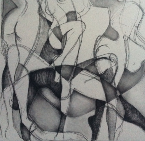 The pieces I have exhibited is a charcoal illustration on a suspended piece of calico with layers of organza suspended in front. Also, a charcoal illustration on stretched canvas title Limb Shady, get it get it Slim Shady, oh dear...